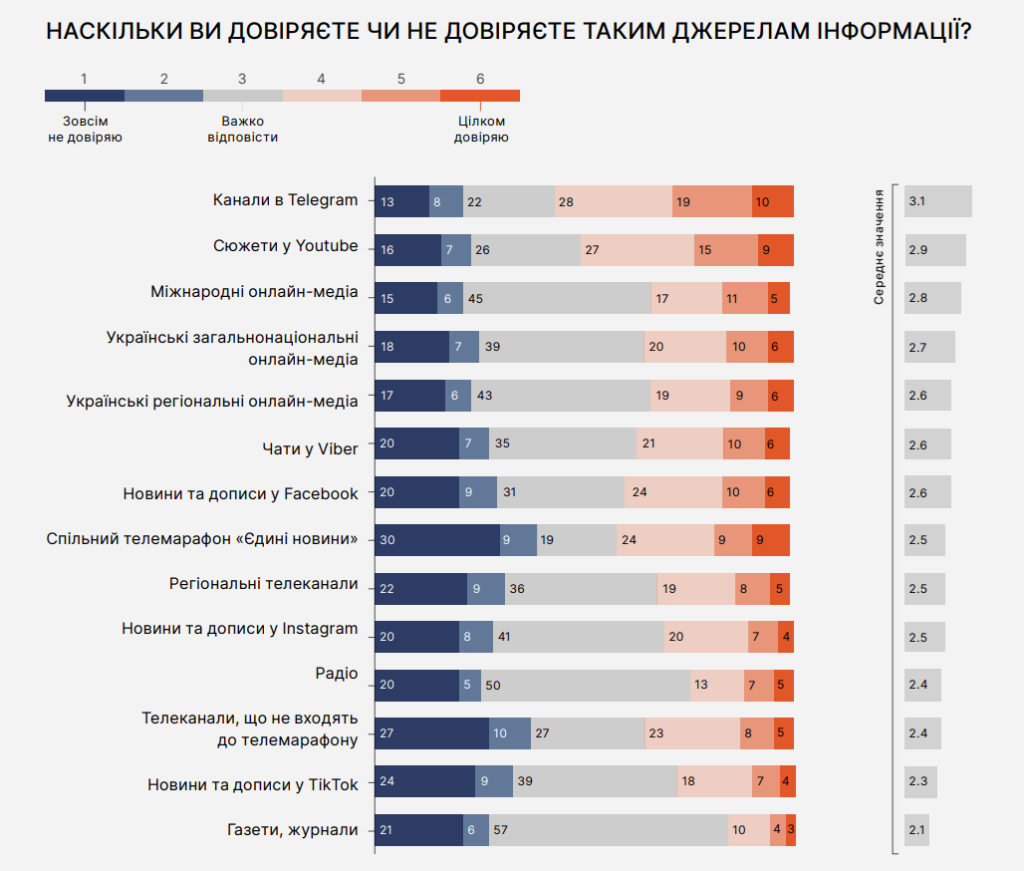 • Українці мало довіряють медіа загалом. Але відносно більше довіри – до Telegram-каналів (29%) і Youtube-каналів (24%).