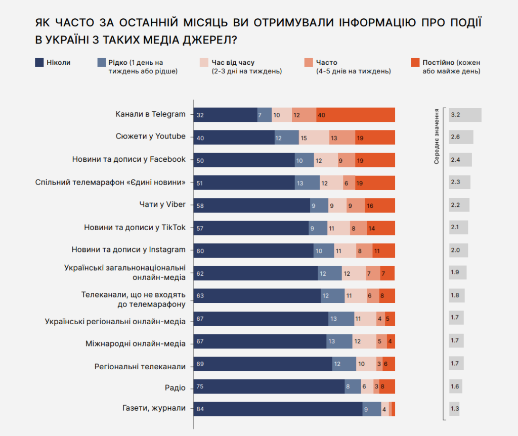 • Telegram – головний засіб отримання інформації про актуальні події для українців. Телеграм-канали постійно або часто (4-5 днів на тиждень) читає загалом понад половина опитаних (52%).