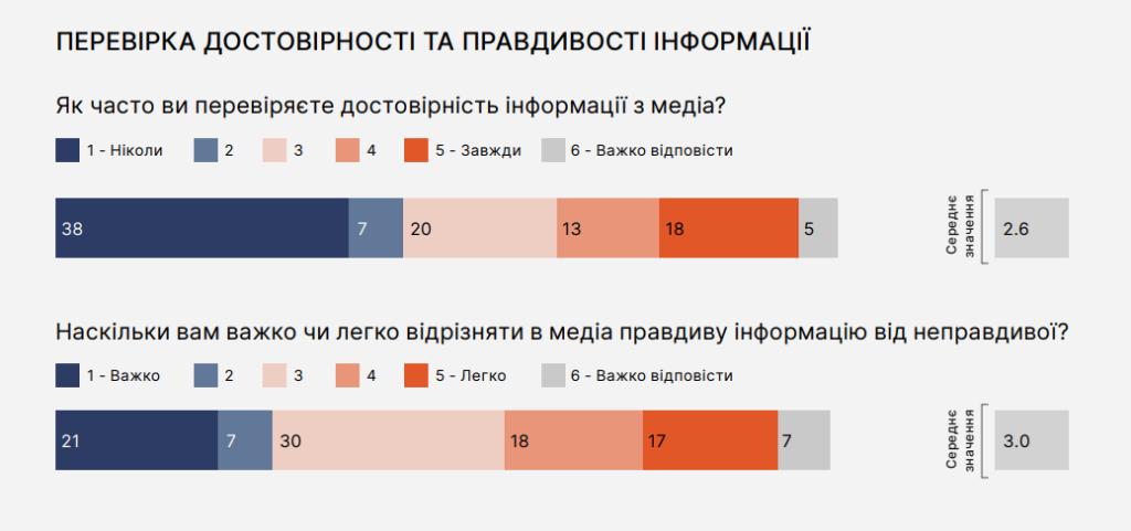 • 35% вважають, що їм легко або скоріше легко відрізняти правдиву інформацію від неправдивої в медіа, 28% — що їм це робити важко або скоріше важко.