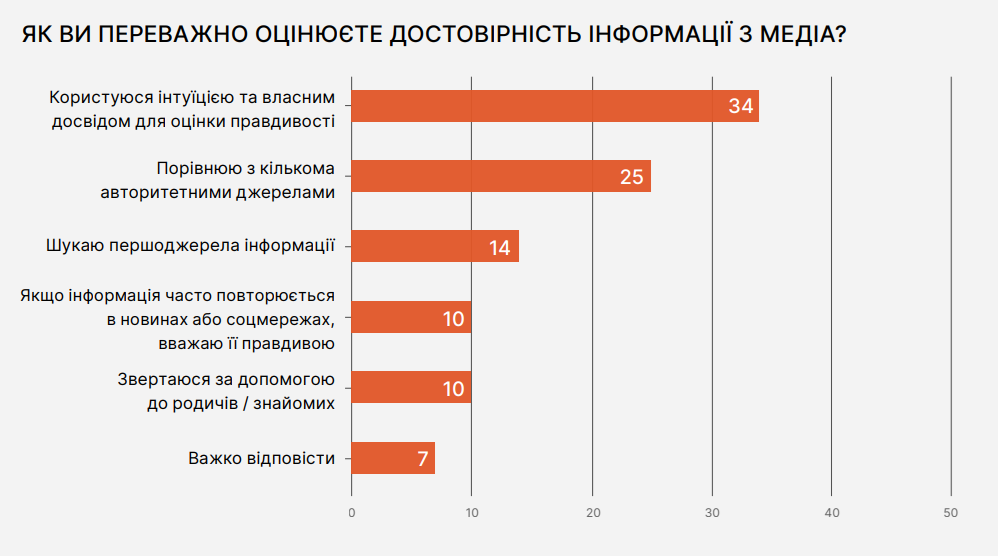 • Найпоширеніші практики перевірки достовірності – це використання власної інтуїції та досвіду (34%) і порівняння з кількома авторитетними джерелами (25%).